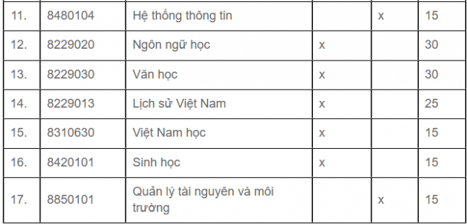 * Khối ngành VII (Văn học, Ngôn ngữ học, Lịch sử Việt Nam, Việt Nam học, Tâm lý học, Công tác xã hội, Quản lý tài nguyên và môi trường):
